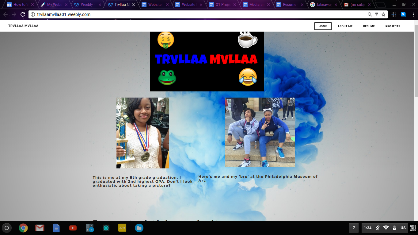 This website that I created was made to let people know a little bit more about me. It took me about 2 weeks to create and I enjoyed making it. I'm not very artistic, so creating a design was a struggle for me but I still came up with something. Hopefully after someone goes onto my page they'll learn something about me and it will inspire them to make a website as well.