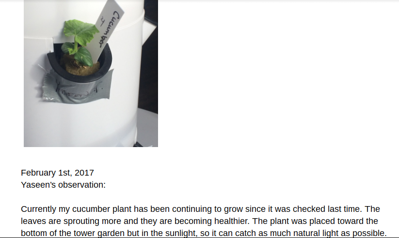 Growing for me wasn't that much of an issue because my plant was able to sprout and grow strong without any problems. In unit one we went over our individual ecological footprint and realizing how many earths we all take up to fulfill our everyday activities. In unit two we focused a lot on environmental justice, and also the uses of land and water in Philadelphia. This plays a roll when it comes to gardening in Philadelphia. The thing is that with these tower gardens you can garden anywhere even if that is right in a class room. I learned a lot and It is interesting to see my cucumber plant grow.