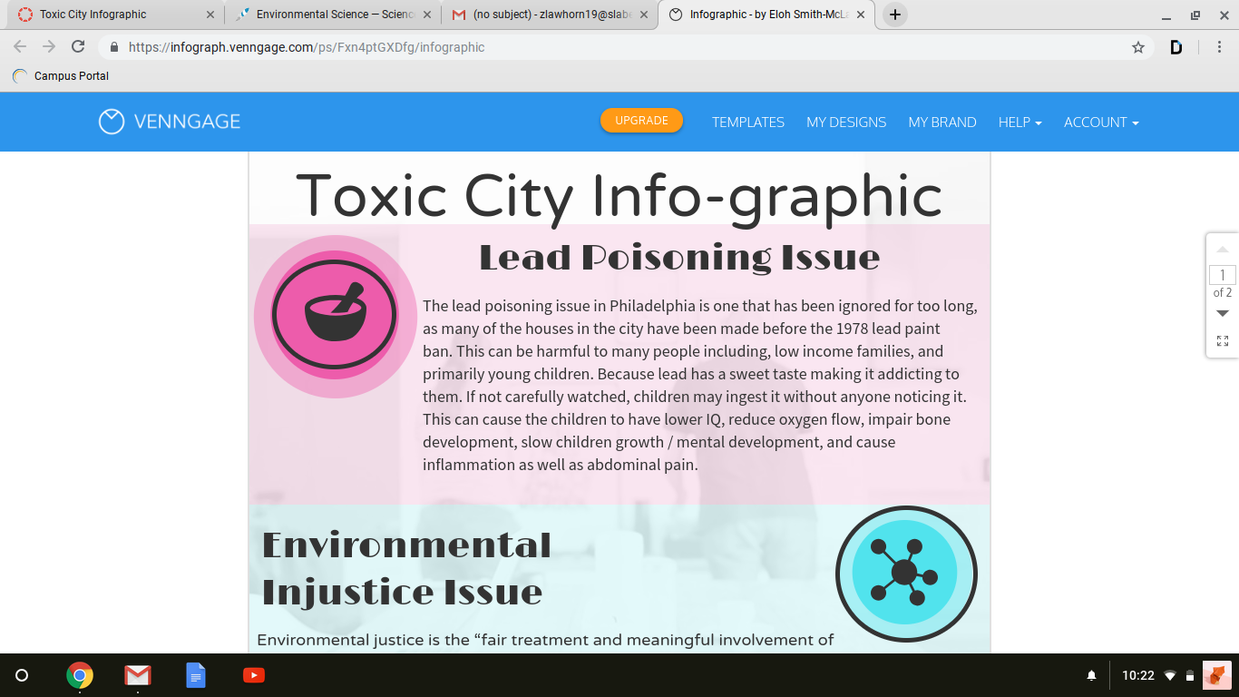 When I first heard Ms. Aziz talk about how we are being poisoned by our own city I didn't really know what to think. I know for a fact, however, lead poisoning did not cross my mind at all. I have been living in this city for almost 18 years now and I never heard about cases about lead being a problem, yet, there are so many. This project opened my eyes to see how much this city needs to improve not only their water systems but maintain the old neighborhoods. We should be educating children and helping them grow, not hurting them. Infographic: https://create.piktochart.com/output/33892782-our-toxic-city