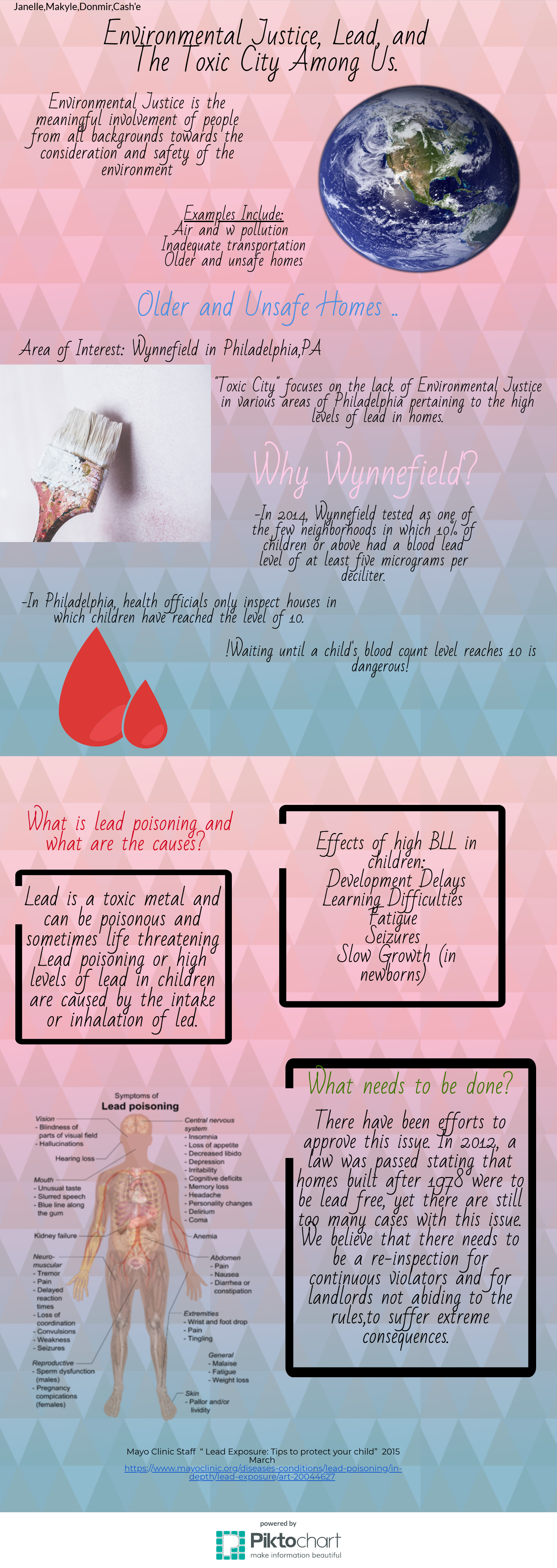 The title of the article is “Philly’s shame: City ignores thousands of poisoned kids” and was written by Barbara Walker, Wendy Ruderman, and Dylan Purcell / Staff Writers Photos and video by Jessica Griffin / Staff Photographer. This article was about how Led is a major issue in Philadelphia. I didn’t know it was this bad until I read the article. The article basically was highlighting that the lead poisoning was coming from chipped paint. The chipped paint in the homes built before 1978 had lead paint in them. They were banned because of the damage it can cause which is exactly what's happening right now. Led poisoning can cause permanent brain issues, affecting development, I.Q, and can cause behavioral issues. I wonder if there could be a program or something to fix all of the paints in the home. I also wonder if their is anyway to mask or control the amount of lead exposure coming from the chipped paint.