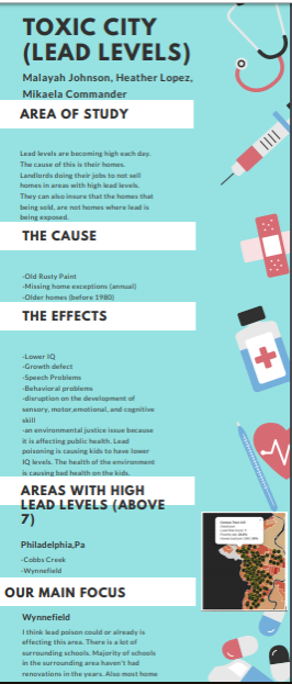 This week we read an article tilted Philly's shame: City ignores thousands of poisoned kids. This article talked about the extremely high levels of lead in the poorer parts of the city of Philadelphia. The children in these rented houses would eat old paint chips that would start to peel off. The lead paint chips had a sweet taste to them which is just like candy for these kids. Exposure to lead can cause anemia, weakness, and kidney and brain damage. This issue can be resolved by the landlords of these rented houses start xing the old paint in houses and we need treating every kid who already has lead poisoning, not just the really sick ones. Yes, we believe this is an environmental justice issues because environmental justice is the involvement of all people and certain kids who have lead poisoning aren’t even getting treated. https://padlet.com/lhoward191/esvw86t2ow1f