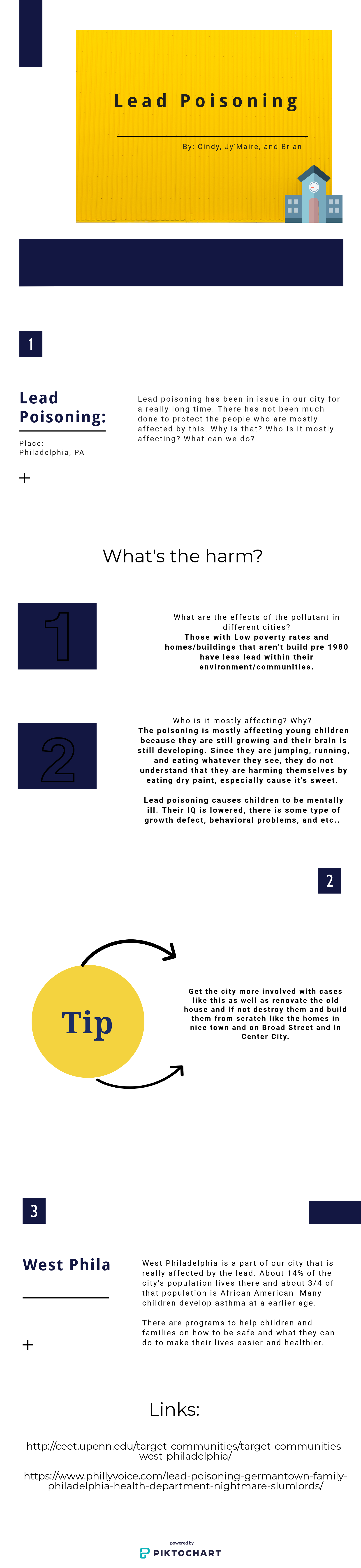 This week we read an article about lead poisoning in Philadelphia, and I was very shaken by what I read. Philadelphia has a high poverty rate and the highest lead poisoning percentages out of all the cities. Our state does nothing to help these children and families that are being affected. The laws aren't enforced and the landowners are not following procedures. What is the next step? What can we do?
