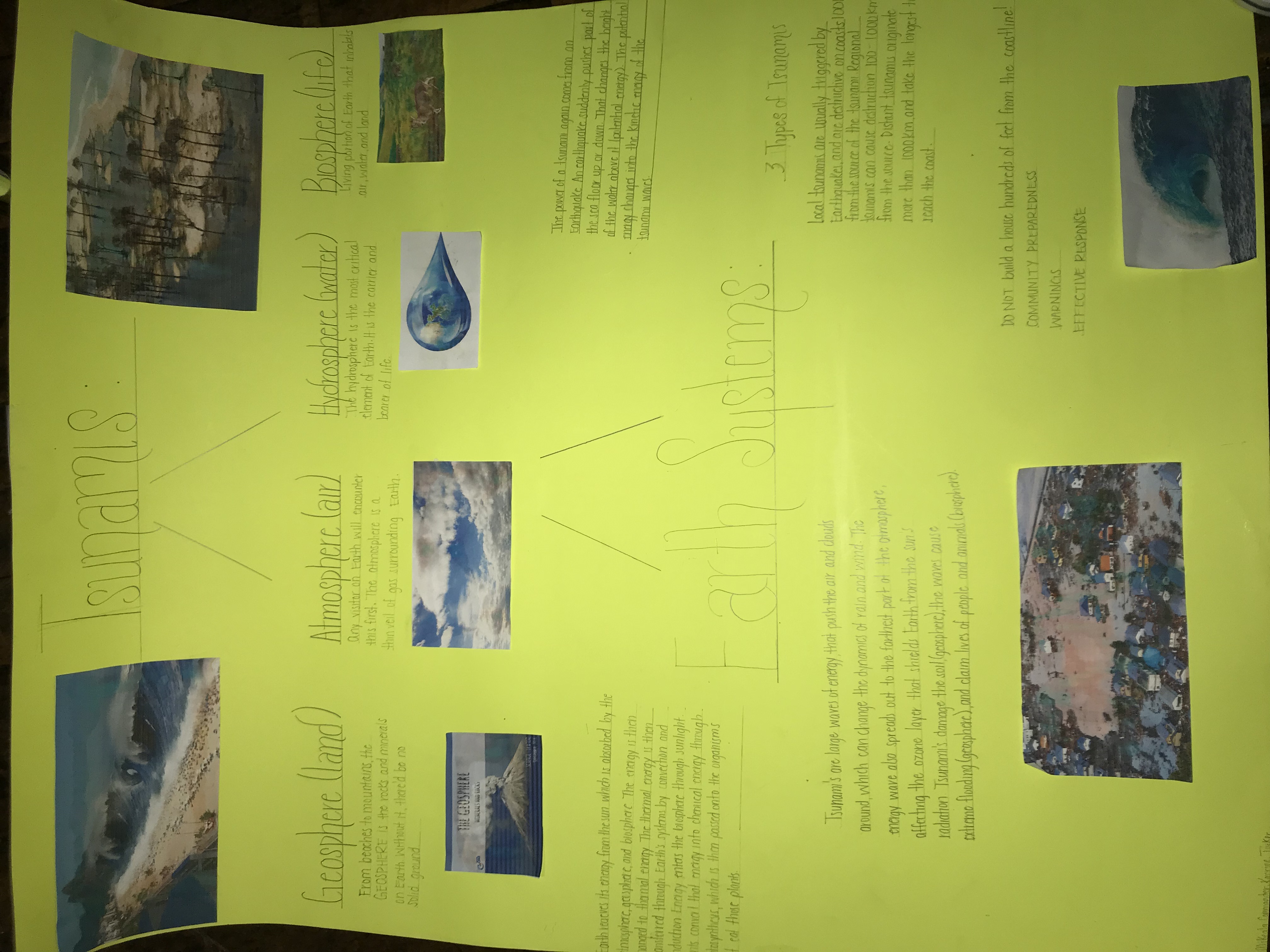 All of the components of the Earth system are dependent upon each other. When a change occurs in one system it will affect all of the other systems in different ways. For example during tsunamis the hydrosphere is negatively changed, resulting in changes to the biosphere such as causalities, drowning, and etc. Tsunamis also affect the geosphere because the soil is damaged. A better understanding of environmental science, the way the Earth systems interact could aid in handling natural disasters. More knowledge about them can help better prepare people that are commonly affected by natural disasters. In order to sustain the future we can make efforts to keep the environment clean.We should stop littering and polluting the air because natural disasters are normally a result of global warming. As a people we should use our resources for things that will help the earth. Based on the feedback I got from our presentation it seemed that most people gained knowledge on Earth's system and tsunamis. It was bought to my attention that next time we should consider adding color, and making the text bigger.