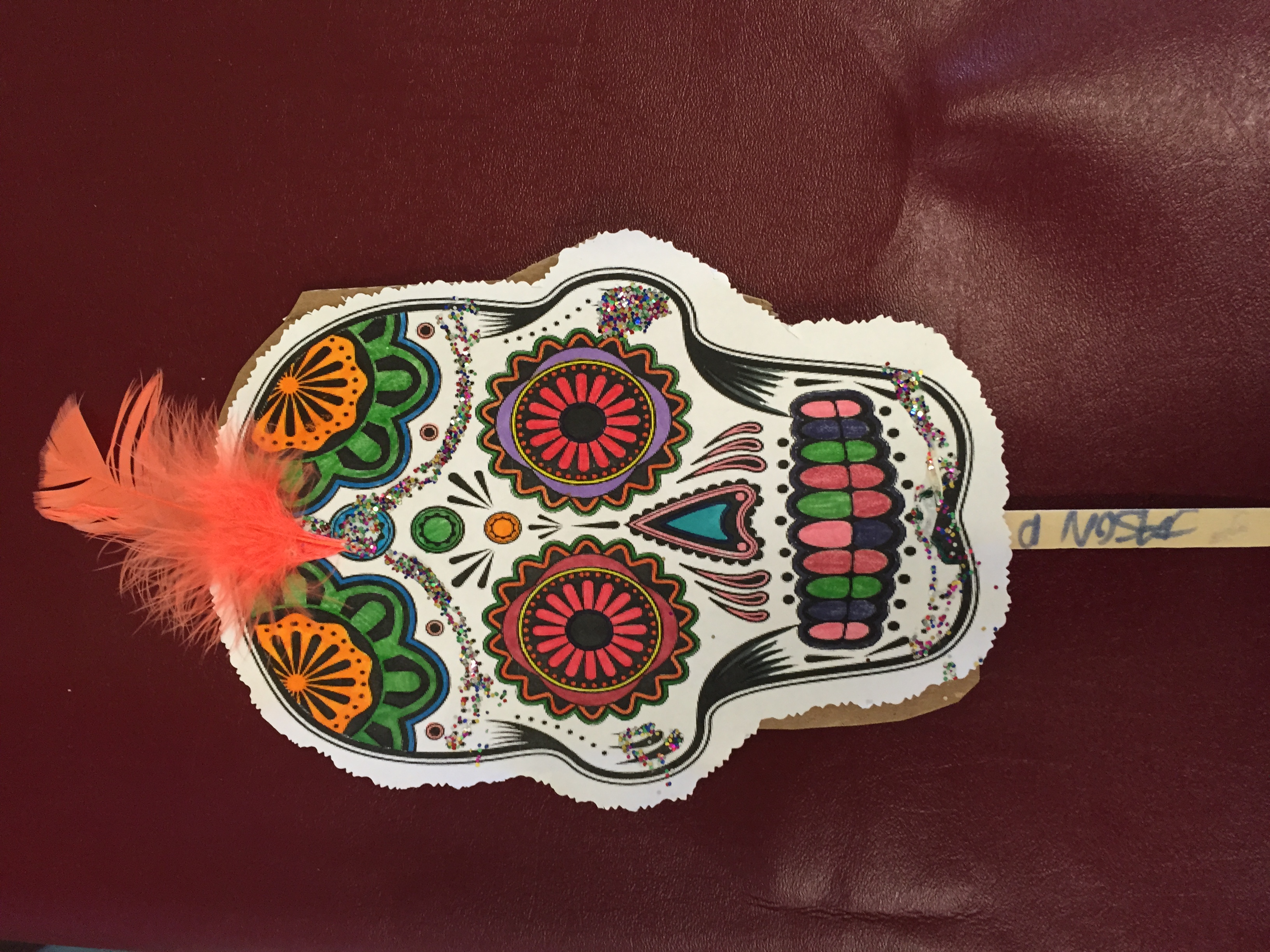 d. My sugar skull reflects my cousin because i designed it with features of things she liked. If you look at my skull you would notice that there is kind of a flower design around the eye socket. I did that because she loved playing with flowers and i also colored it purple with some blue lining because those were her favorite colors. .What better way to represent my lost loved one with one of the things she liked the most.