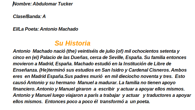 ​ For the poetry project students had to choose a Spanish/Hispanic poet from the ones provided. After choosing our poet we had to research and learn more about them. There was multiple tasks and parts of this project that was needed to complete in order to earn a good grade and meet or exceed expectations. These parts included writing a biography about the poet that was chosen by the student completely Spanish, find a poem that the student liked, write about what we thought about the poem, like themes, write an autobiography and also make a poem based on the same type of theme. All of these parts had to be completed in Spanish.