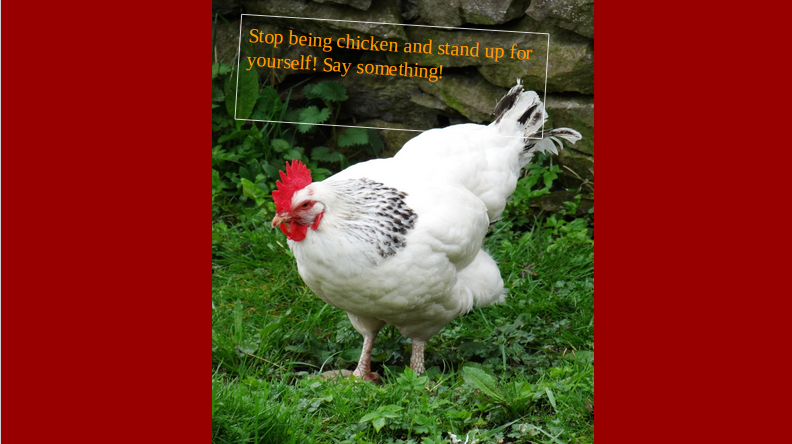 The first thing came to mind when I saw this photo was the fact that it was perfect, and that it help comprehend what I wanted to write. Some people just do not wanna stand up to cyber bullies because they just do not have the voice. I tried making something that has a motive to help these people. Plus the term of calling someone chicken basically means that you are scared to do something. Overall this is something that helps the community and I hope others enjoy it!